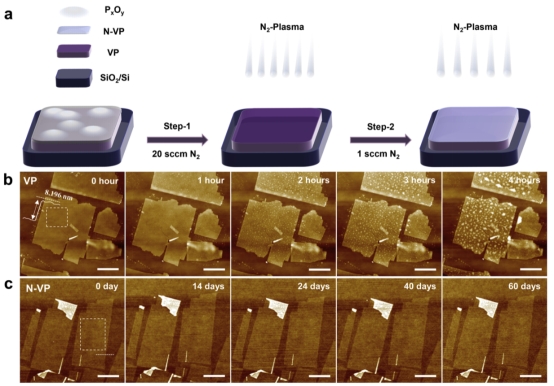 原子力顯(xiǎn)微鏡測試表(biǎo)明(míng),經過兩步處理後,N-VP的平(píng)整度(dù)可保持(chí)至少60天,而普通2D-VP僅數小時便(biàn)會降解。這一突破(pò)表(biǎo)明(míng),N-VP無需複雜封裝或環境控製(zhì)即可集成(chéng)到實際器件中。
