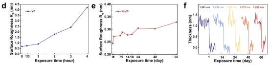 圖3: d) 原始紫磷因(yīn)降(jiàng)解導致粗糙度上升 e) 氮摻雜紫磷在60天後仍保持低粗糙度 f) 氮摻雜紫磷的狀態。圖片由DOI: 10.1021/acsnano.4c09083提供
