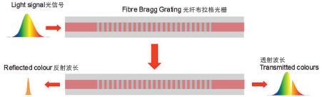圖2:當寬帶光發射到(dào)帶有光纖布拉格光柵的(de)光纖中時,隻有一種顏色的(de)光會被反射,其他(tā)顏色的光則會在光纖中傳輸
